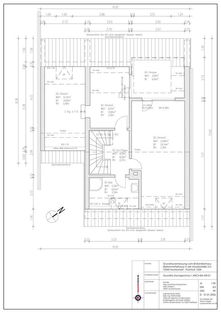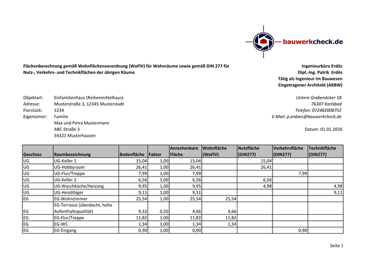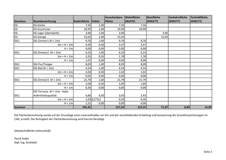 Ohne ein korrektes Aufmaß vor Ort, ist auch keine korrekte Flächenberechnung möglich. Z.B. müssen vor Ort bei Dachschrägen in jedem Raum die Höhenlinien (0,5 m / 1,0 m und 2,0 m) mit vermessen werden, damit dann die Wohnflächen korrekt berechnet werden können. So zählen in der Wohnflächenberechnung z.B. Raumbereiche mit einer Höhe unter 1,0 m, nicht in die Berechnung der Wohnfläche dazu und Raumbereiche zwischen 1,0 m und 2,0 m Höhe, werden nur zu 50 % anteilig berücksichtigt.