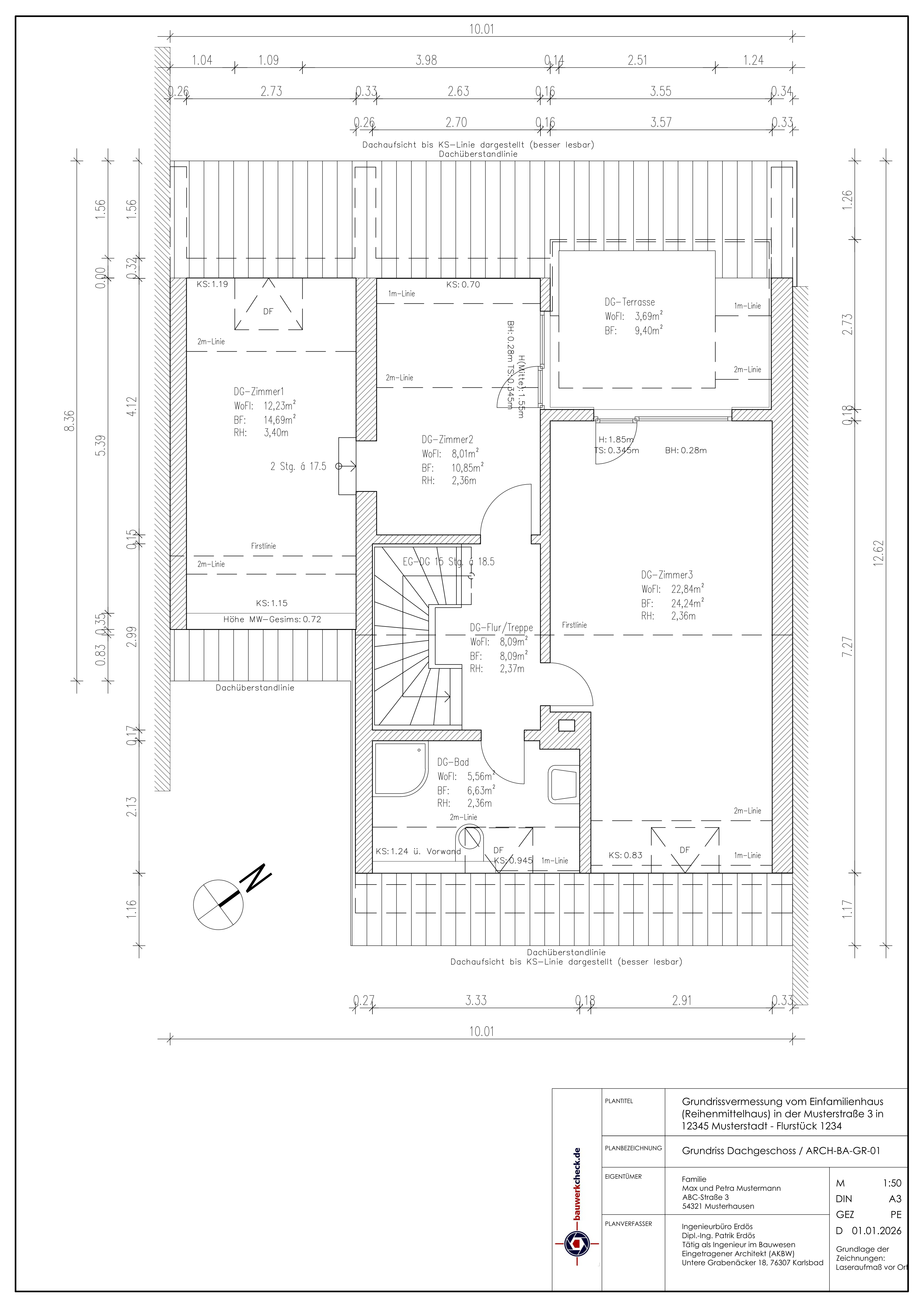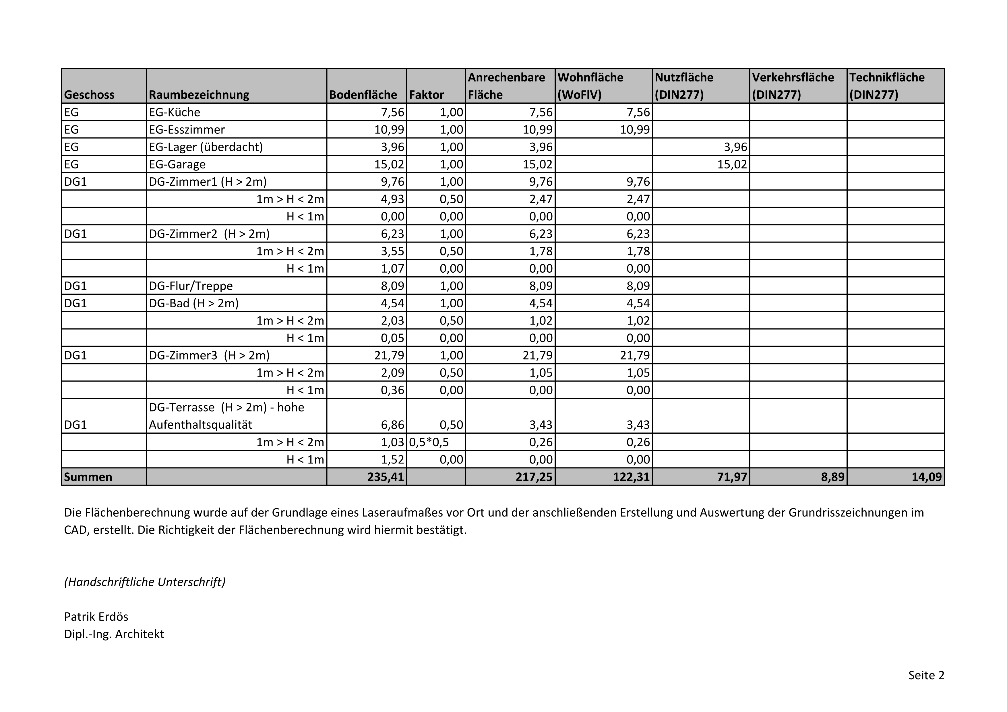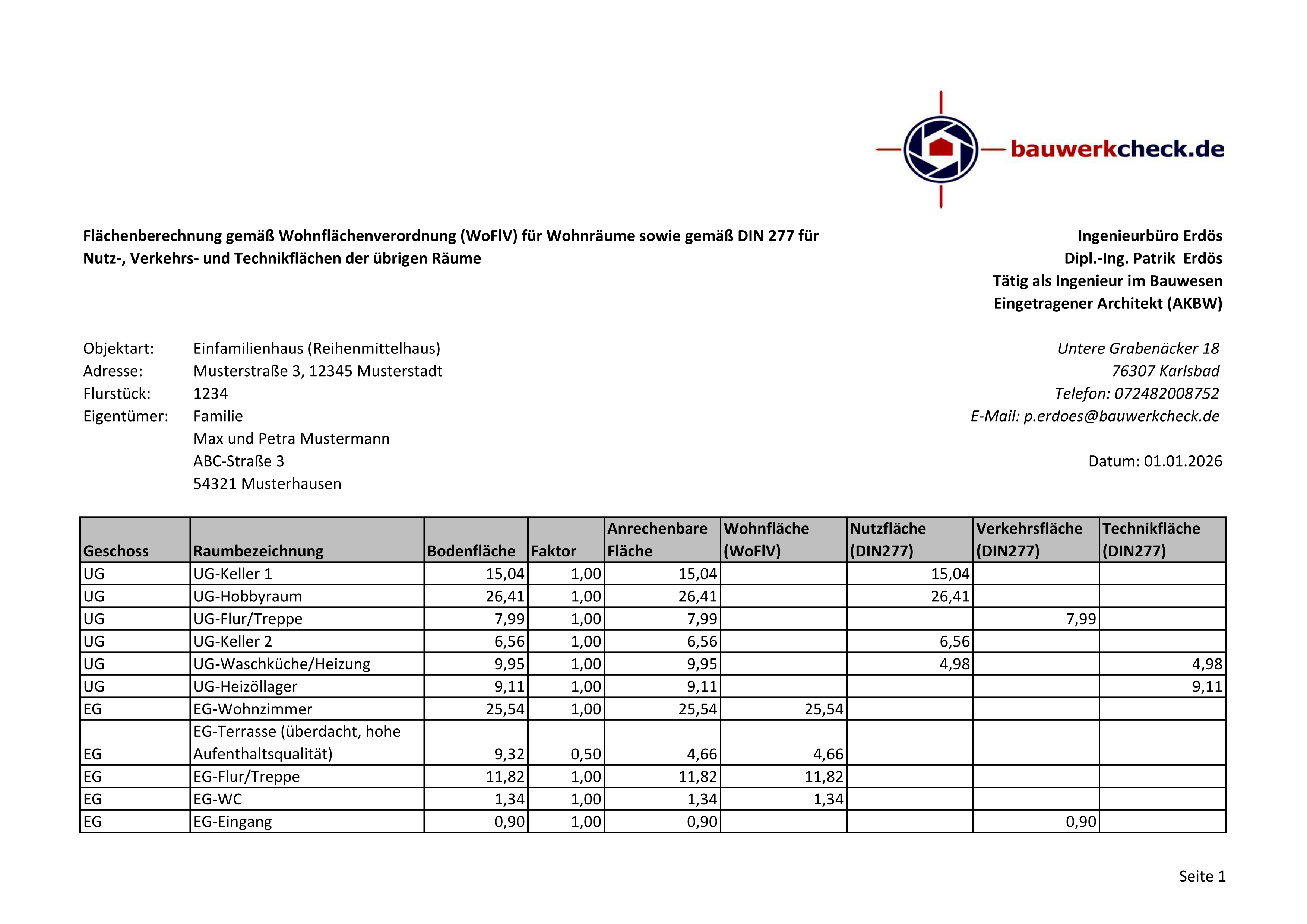 Ohne ein korrektes Aufmaß vor Ort, ist auch keine korrekte Flächenberechnung möglich. Z.B. müssen vor Ort bei Dachschrägen in jedem Raum die Höhenlinien (0,5 m / 1,0 m und 2,0 m) mit vermessen werden, damit dann die Wohnflächen korrekt berechnet werden können. So zählen in der Wohnflächenberechnung z.B. Raumbereiche mit einer Höhe unter 1,0 m, nicht in die Berechnung der Wohnfläche dazu und Raumbereiche zwischen 1,0 m und 2,0 m Höhe, werden nur zu 50 % anteilig berücksichtigt.